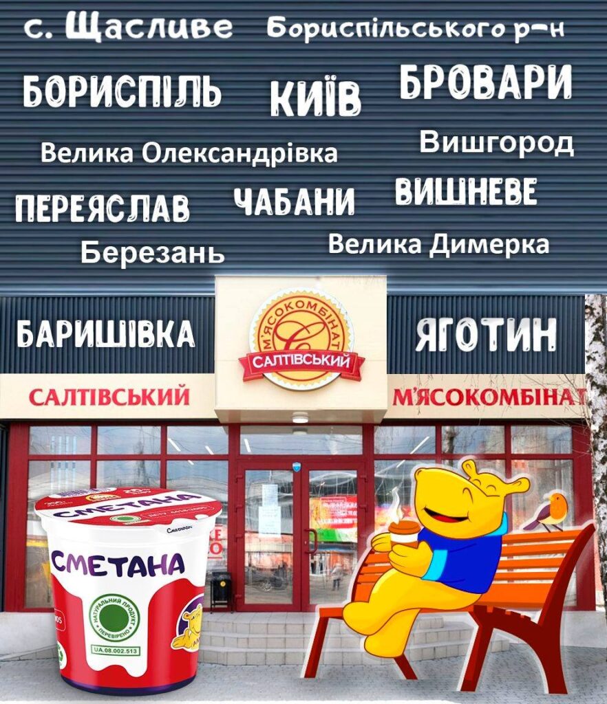 Друзi, вiдтепер молочнi продукти #АМА можете придбати у крамничках Салтівський м’ясокомбінат за адресами: м. Бориспіль, вул. Київський шлях, 76 м. Бориспіль, вул. Лютнева, 1г м. Бориспіль, вул. Київський шлях, 16-в м. Бориспіль, вул. Київський шлях, 90А (Волна) м. Бориспіль, вул. Глибоцька, 81 м. Бориспіль, вул. Завокзальна, 17 с. Щасливе, вул. Героїв Майдану, 28 м. Київ, вул. Щербакова, 72 м. Київ, вул.Мурманська, 6 м. Київ, вул. М. Закревського, 59/1 м. Київ, вул. М. Закревського, 93А м. Київ, вул. Митрополита А. Шептицького, 22 м. Переяслав, вул. Б. Хмельницького, 34 м. Вишгород, пр-т. Шевченка, вул. Шкільна м. Київ, пр-т. А. Корольова, 3 м. Київ, вул. Харківське Шосе, 180/61 м. Київ, вул. Бажова, 15/20 м. Київ, пр-т. Соборності, 4 м.Березань, вул. Шевченків шлях, 146-Г м. Київ, вул. Маяковського, 15 м. Київ, вул. Ольжича, 8 м. Київ, пр-т Лісний, 25 м. Київ, пр-т Науки, 4 м. Київ, вул. Тампере, 12 м. Київ, вул. Академіка Білецького, 1 м. Київ, вул. М. Шепелєва, 6 м. Київ, вул. О. Бойченко, 9 м. Київ, вул Героїв Дніпра 37 Б м. Київ, пер. Татарський, 8 смт.Велика Димерка, вул.Бобрицька, 6 м. Київ, бул. Перова, 22 с.Велика Олександрівка, Борисп. р-н, вул.Котляревського,27 м. Київ, пр-т. Перемоги, 88 м. Київ, вул. Симиренко, 9 м. Київ, пр-т. Перемоги, 117 м. Київ, пр-т. Павла Тичини, 7 м. Вишгород, вул. Кургузова, 3А м. Київ, пр-т. Георгія Гонгадзе, 20 м. Київ, вул. Єреванська, 14 м. Бровари, вул. Сергія Москаленка, 21 м. Бровари, вул. Гагаріна, 9 смт Чабани, вул. Машинобудівників, 5 м. Київ, вул. Мукачевська, 5А м. Київ, вул. А. Ахматової, 3 м. Київ, пр-т Василия Порика, 13 м. Київ, вул. М. Драгоманова, 19 м. Київ, вул. Симона Петлюри, 30 м. Київ, просп.Бажана, 3-В м. Київ, вул. І. Миколайчука, 19 м. Київ, вул. Підлісна, 1 м. Ірпінь, вул. Антонова, 4Б м. Ірпінь, вул. Мечникова, 9 м. Вишневе, вул. Європейська м. Вишневе, вул. Першотравнева, 2