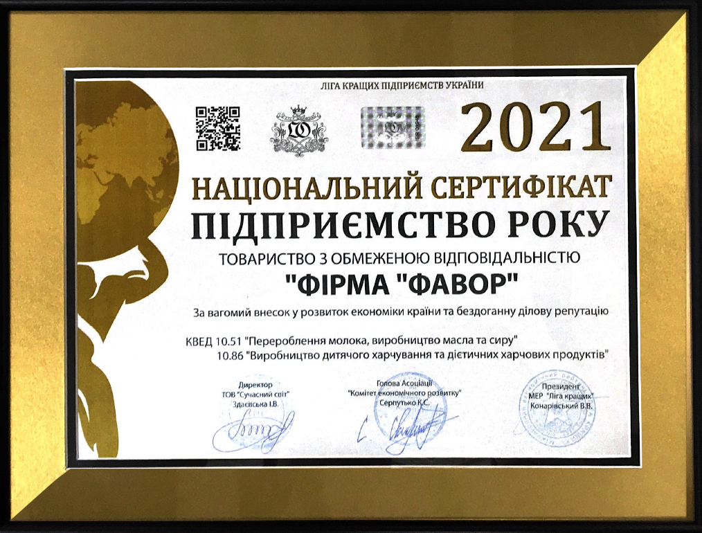 Компанія ТОВ “Фірма Фавор” отримала почесні нагороди «Підприємство року-2021» та «Керівник року-2021» Міжнародного економічного рейтингу «Ліга Кращих» – офіційне підтвердження першості підприємства у своїй галузі. «ФАВОР» зарекомендував себе, як надійний партнер, престижний роботодавець, потужне молокопереробне підприємство, яке володіє сучасною виробничо-технологічною базою та висококваліфікованими кадрами і за правом заслуговує на загальне визнання. За підсумками Президії Міжнародного […]